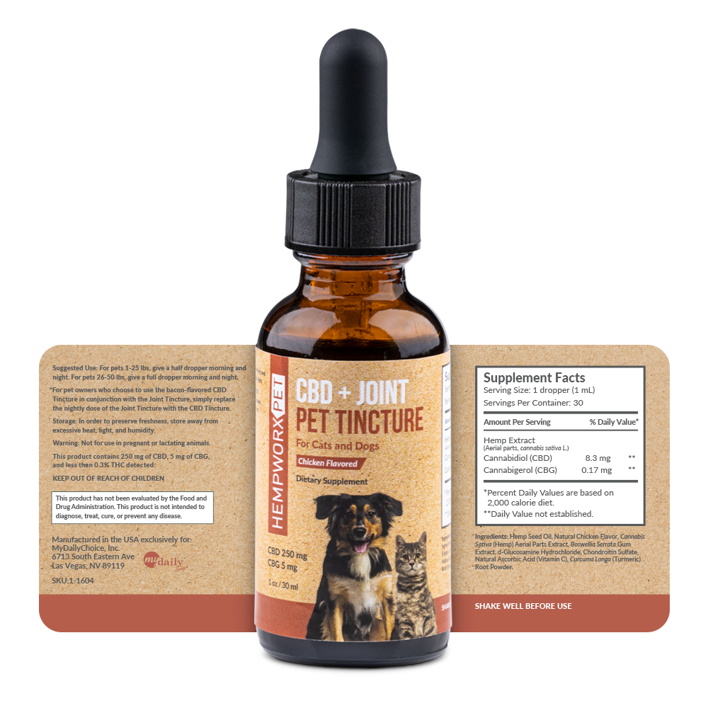 HempWorx CBD + Joint Pet Tincture was developed specifically for older pets. This nutritional supplement is sourced from the highest-quality hemp grown in the United States and is extensively tested for quality and safety. The powerful and natural ingredient blend of CBD, CBG, frankincense, chondroitin, glucosamine, turmeric, and vitamin C supports healthy joints and promotes longevity. The delicious chicken-flavored tincture can be administered orally or added to the pet’s food or water. Help your furry friend live a long active life with HempWorx CBD + Joint Pet Tincture.